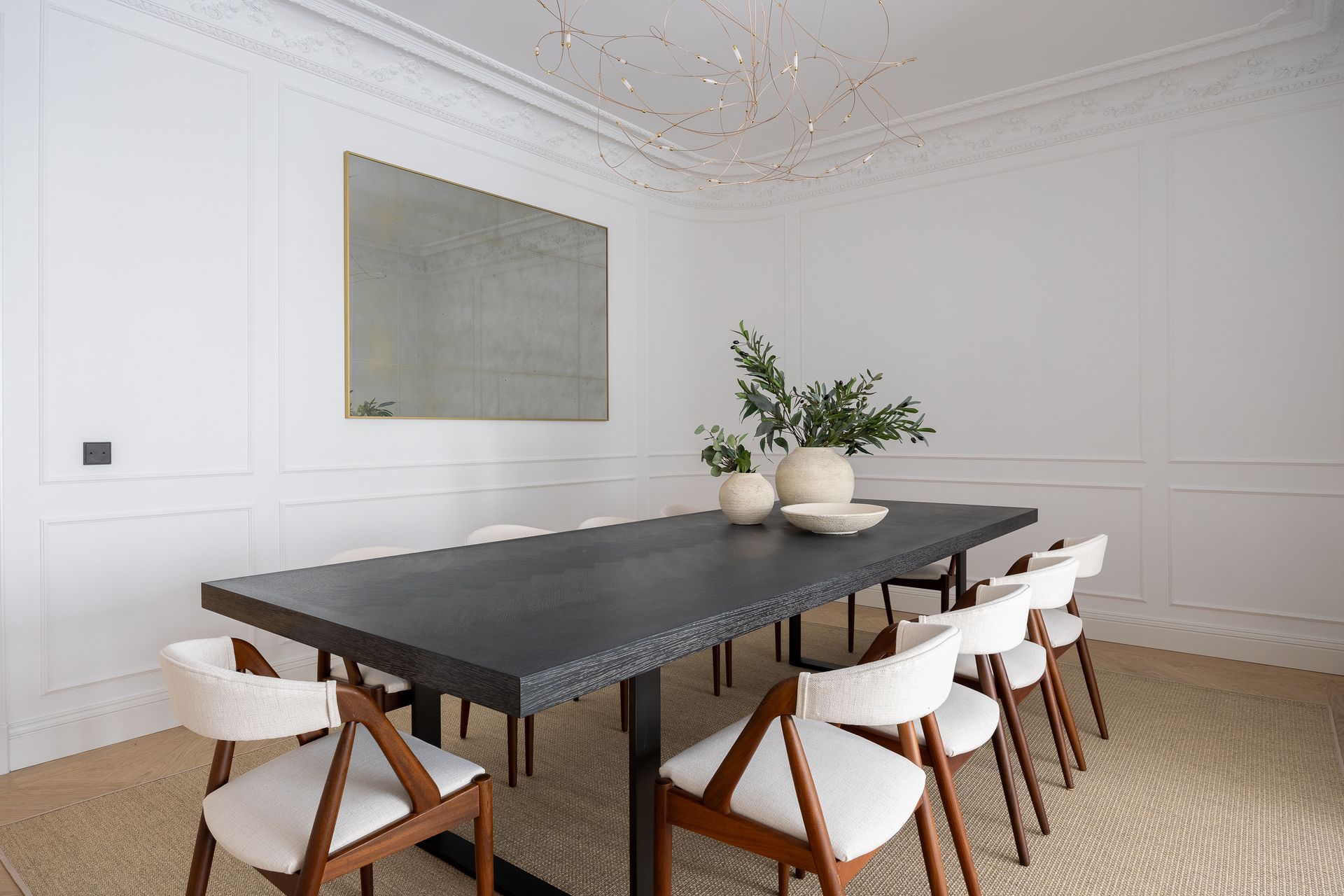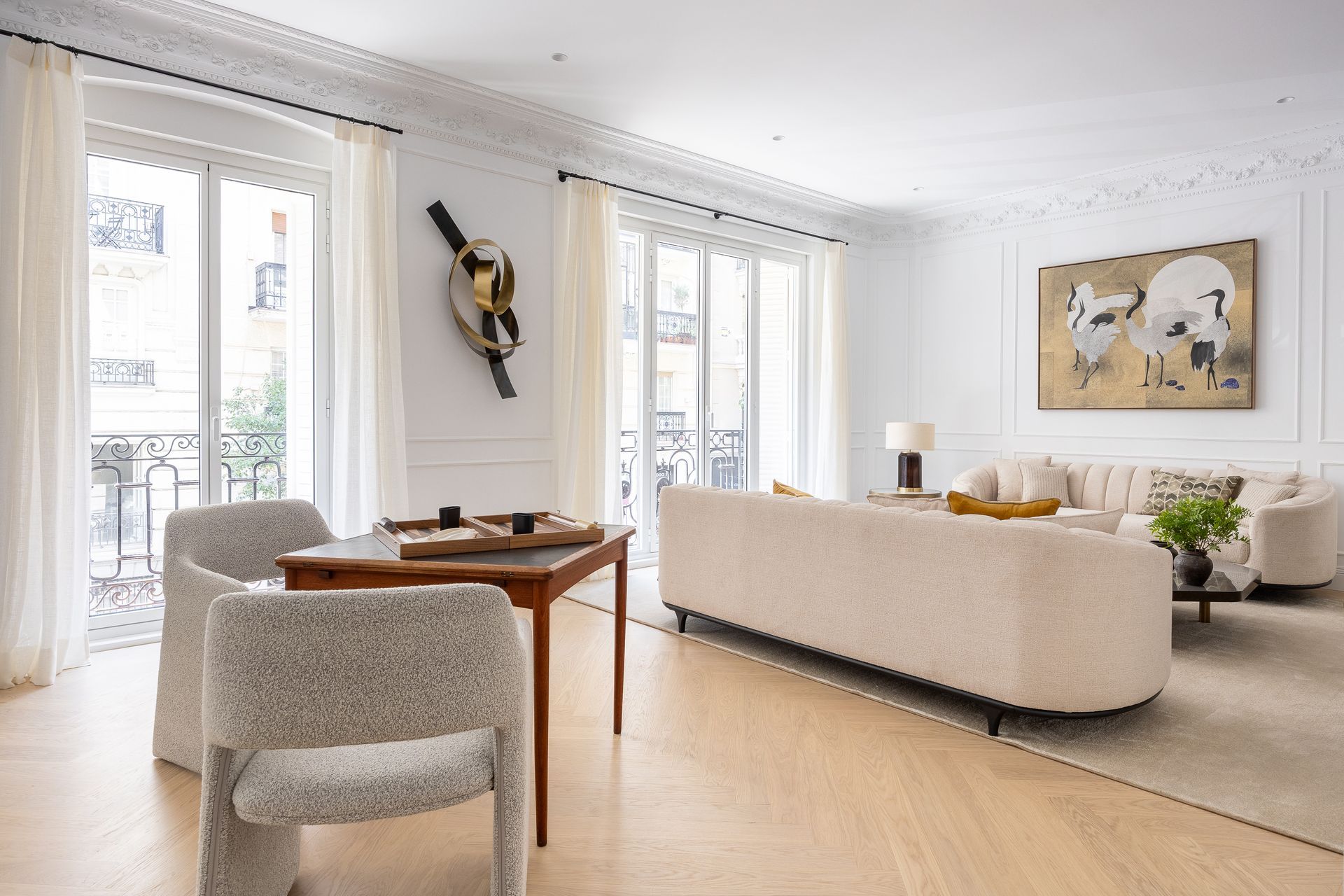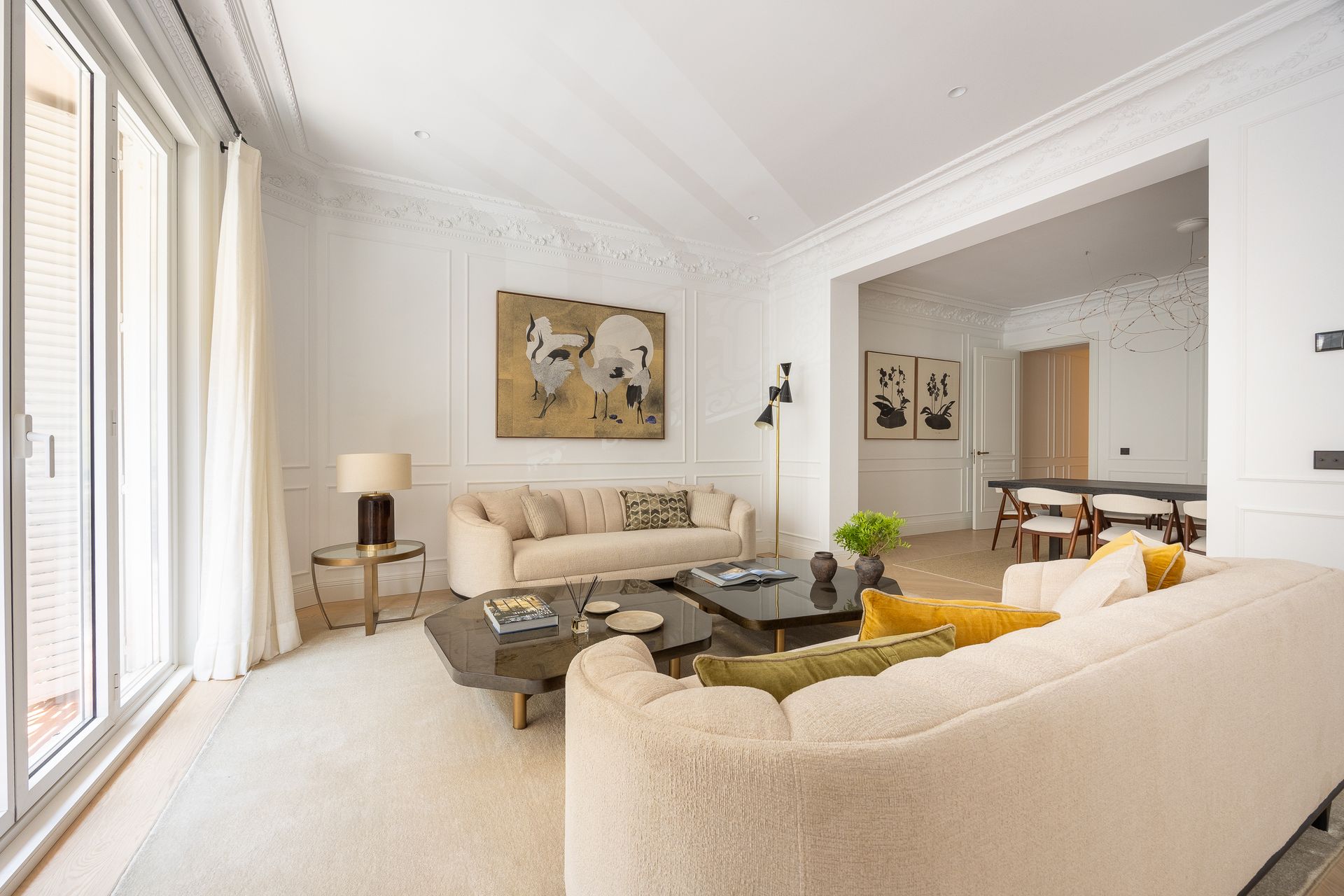 Este piso cuenta con tres dormitorios en suite, ideales para disfrutar de la privacidad y confort. También hay un aseo de invitados y un family room o tv room que tiene salida directa a la espectacular terraza. Elementos arquitectónicos del siglo pasado, como cornisas y molduras, se mezclan con las comodidades actuales para crear un ambiente único.